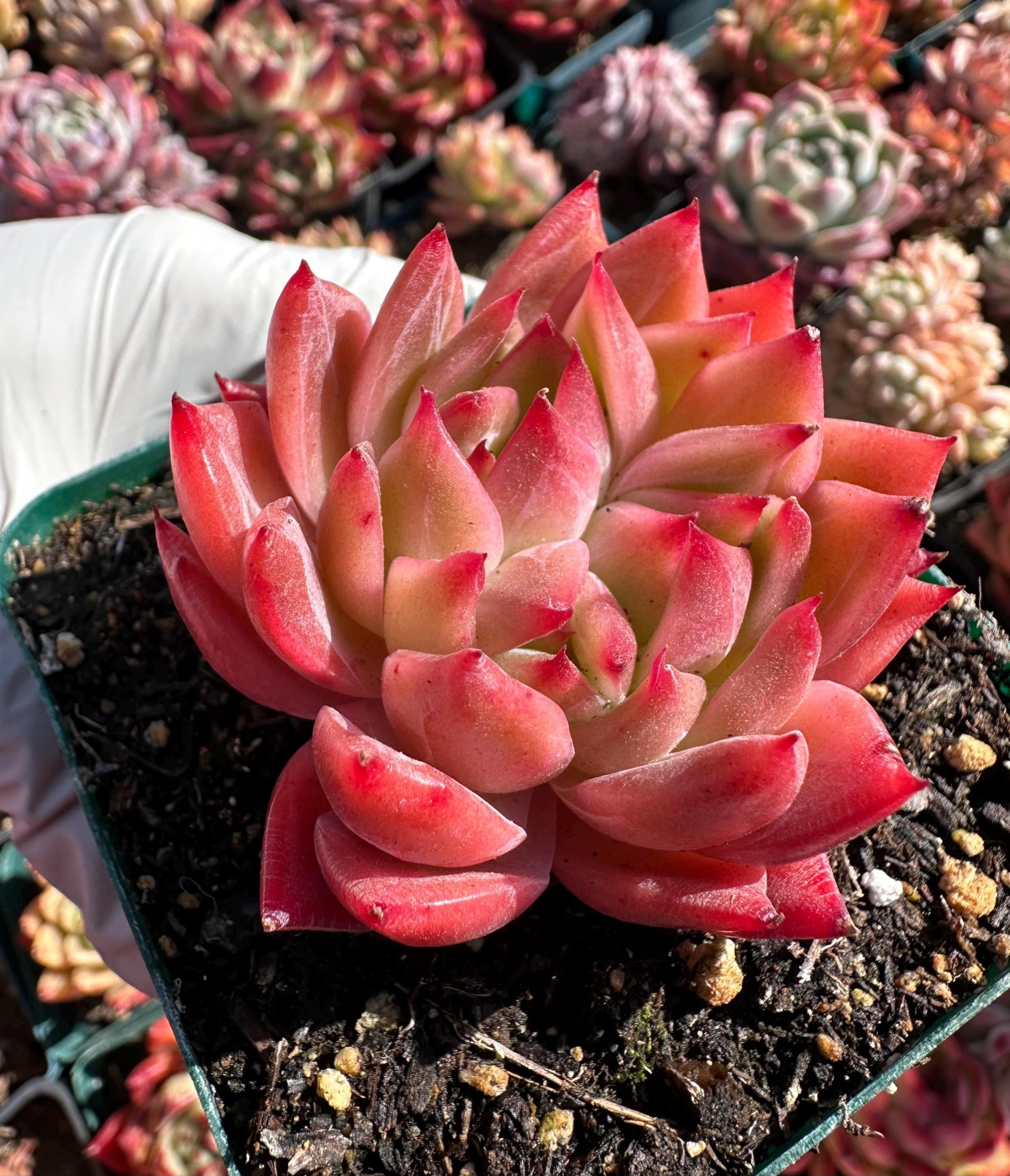 Chubby leaves with strong stem , bright pink red translucent color. This beautiful agavoides echeveria always pink red under sunlight stress.