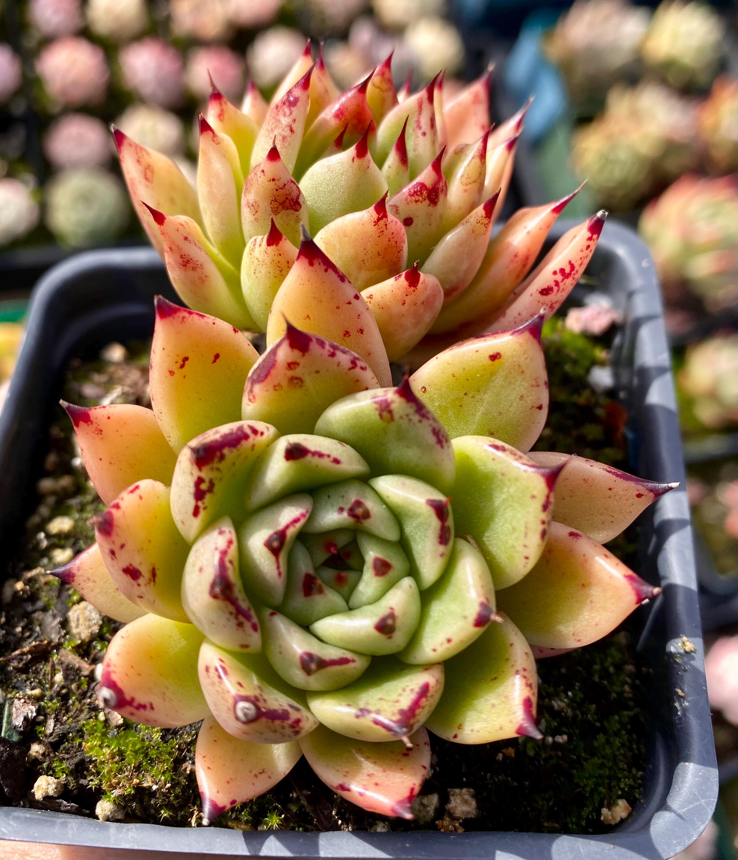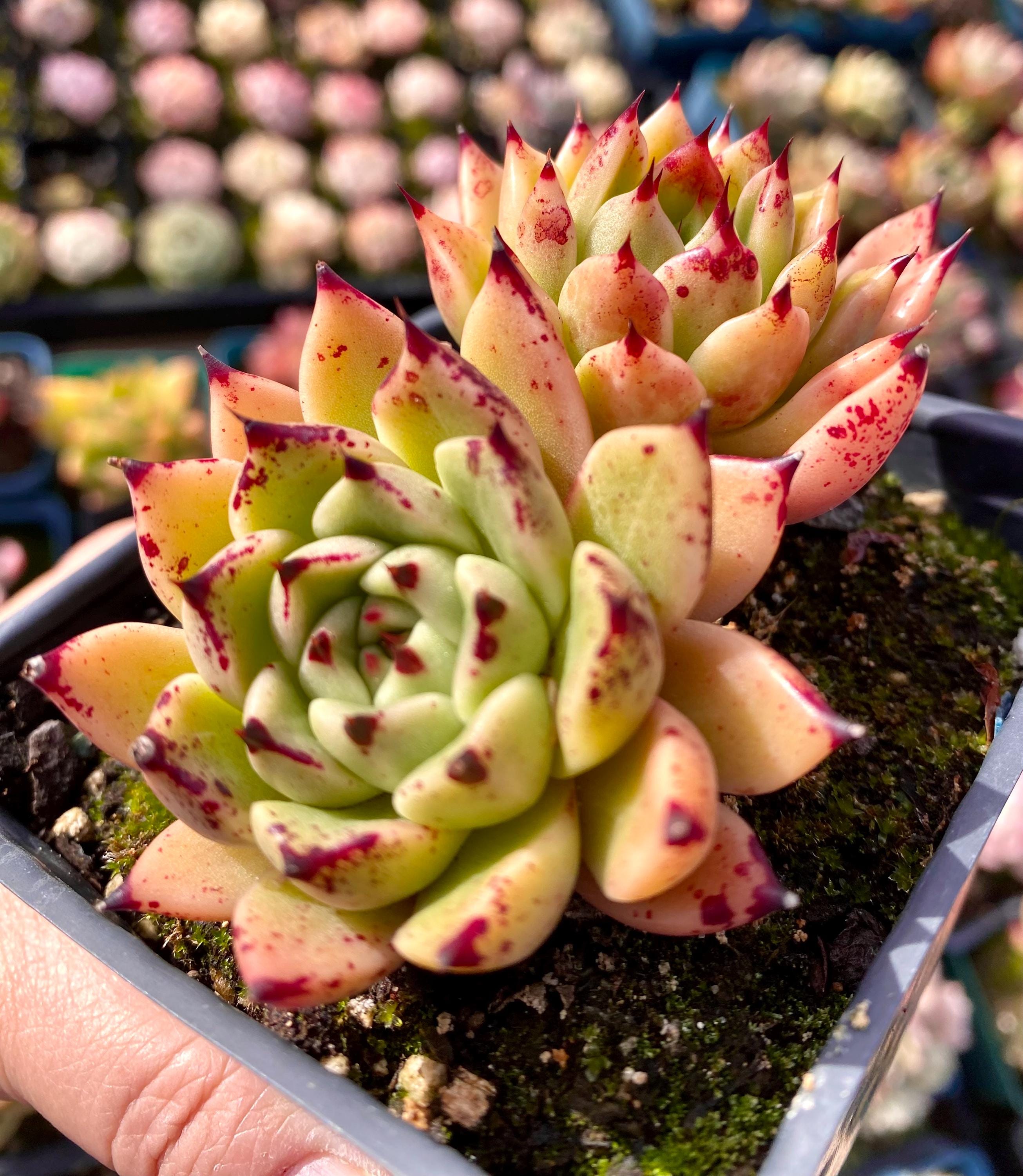 double , CHUBBY, golden & pink 2 tons colorful with BLACK TIPS , also with a lot of bloody freckles on the leaves . looks cool
