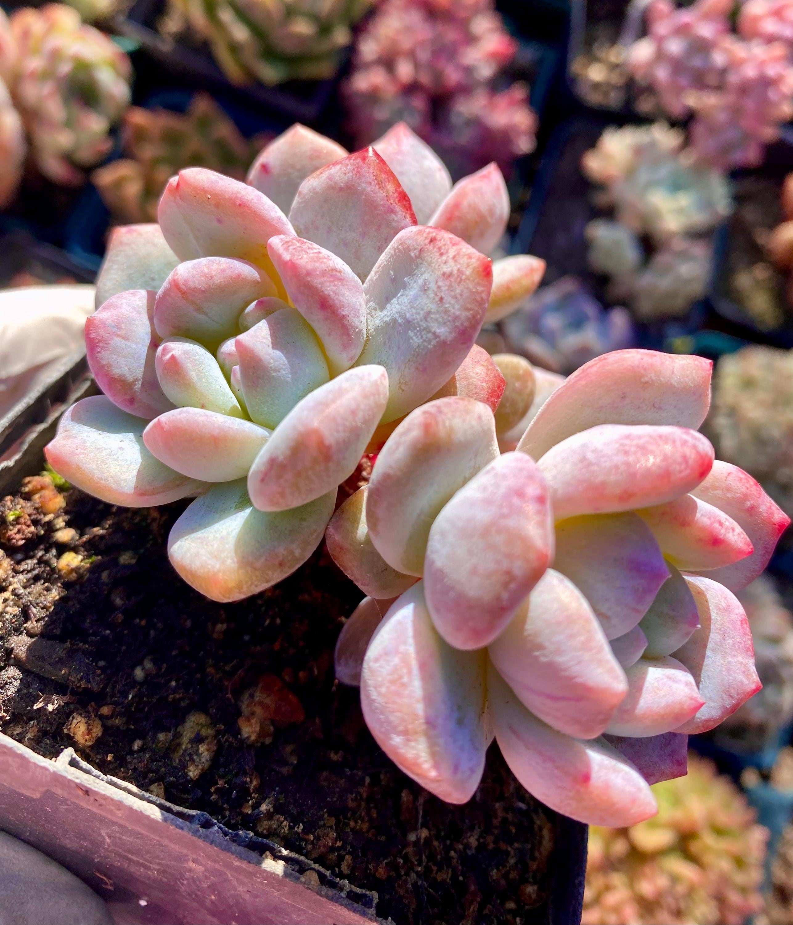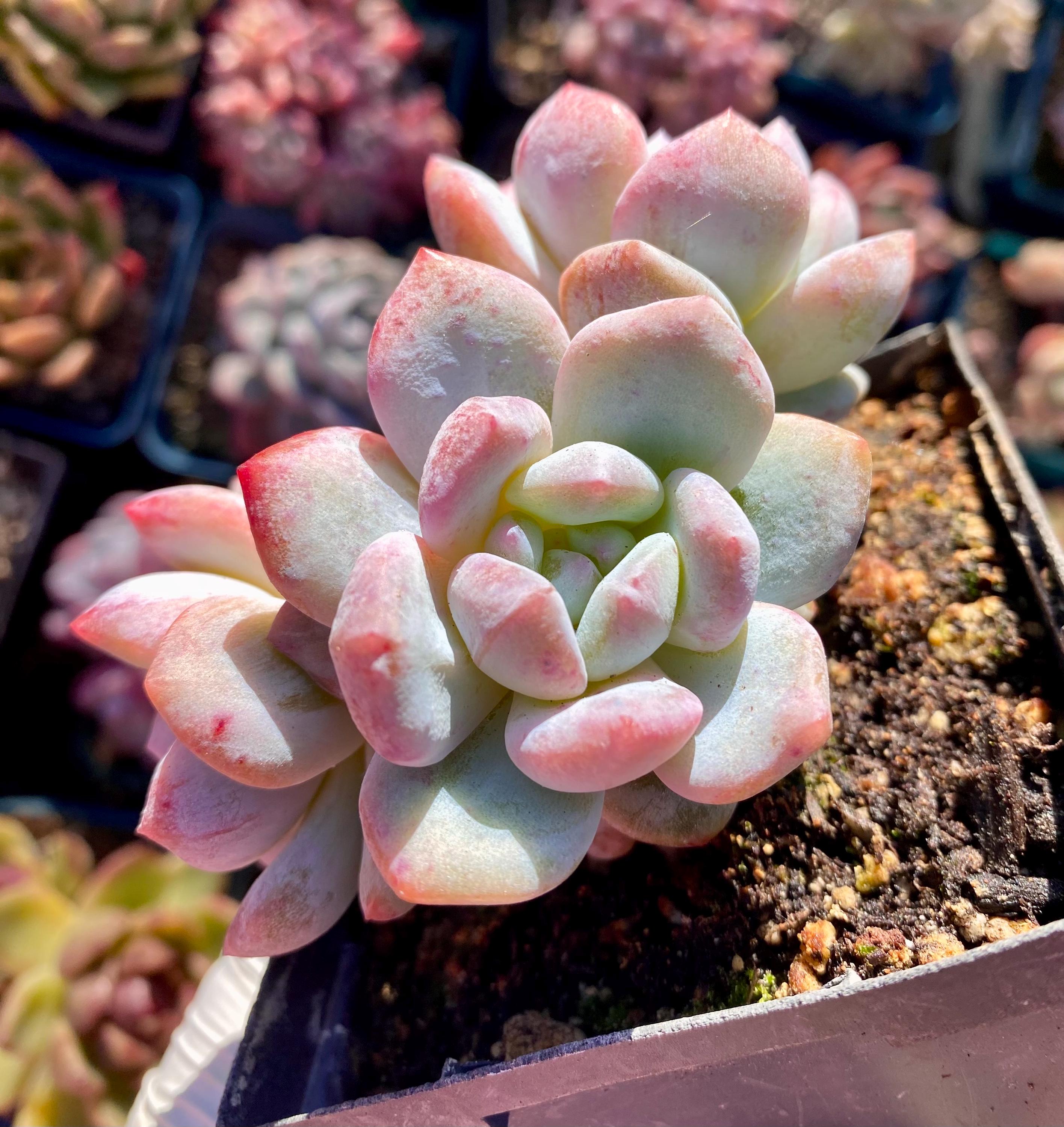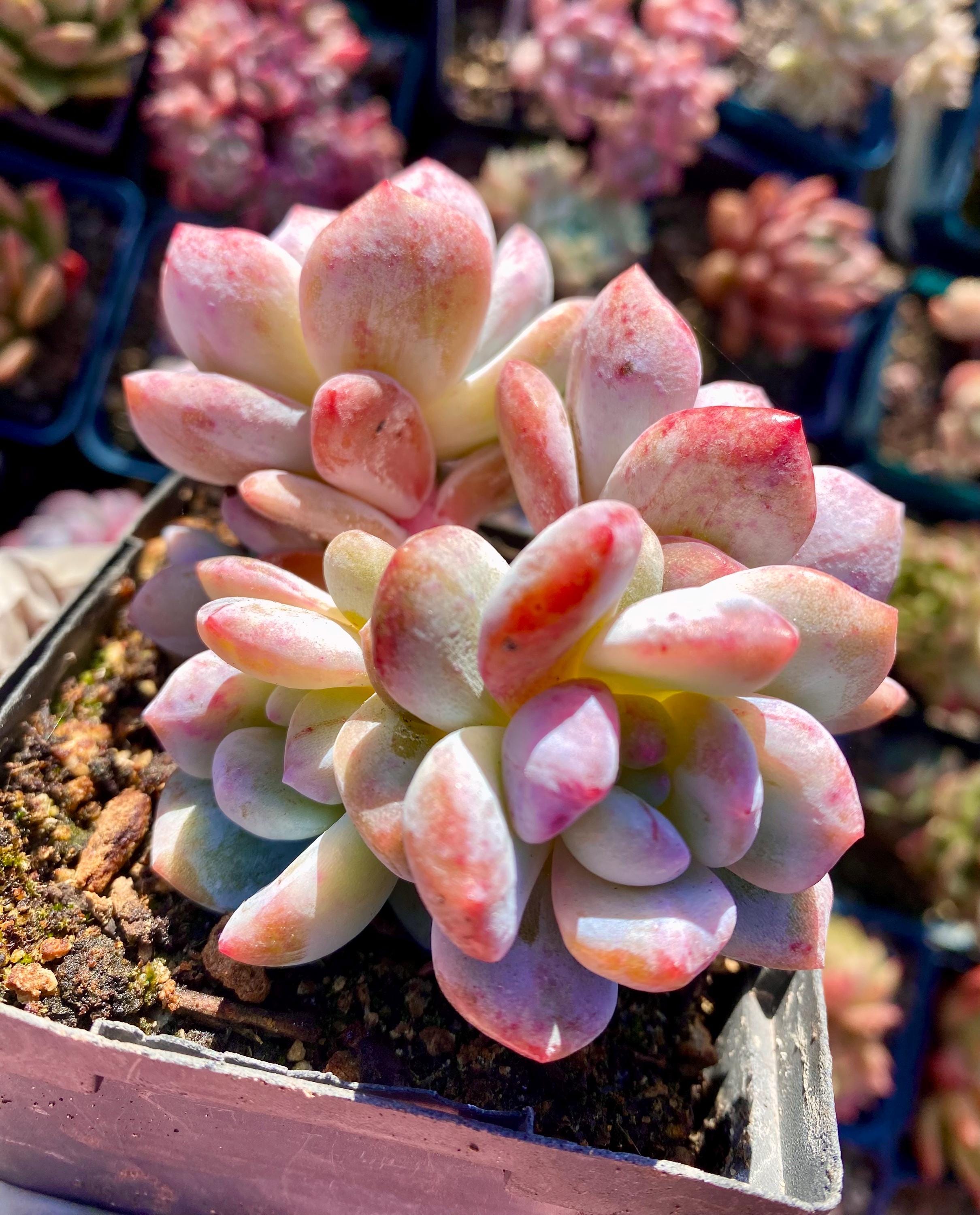 I took these pictures and video under natural light on October 7, this beautiful echeveria will become FULL PINK with variegated and monstrous patterns in cooler weather
