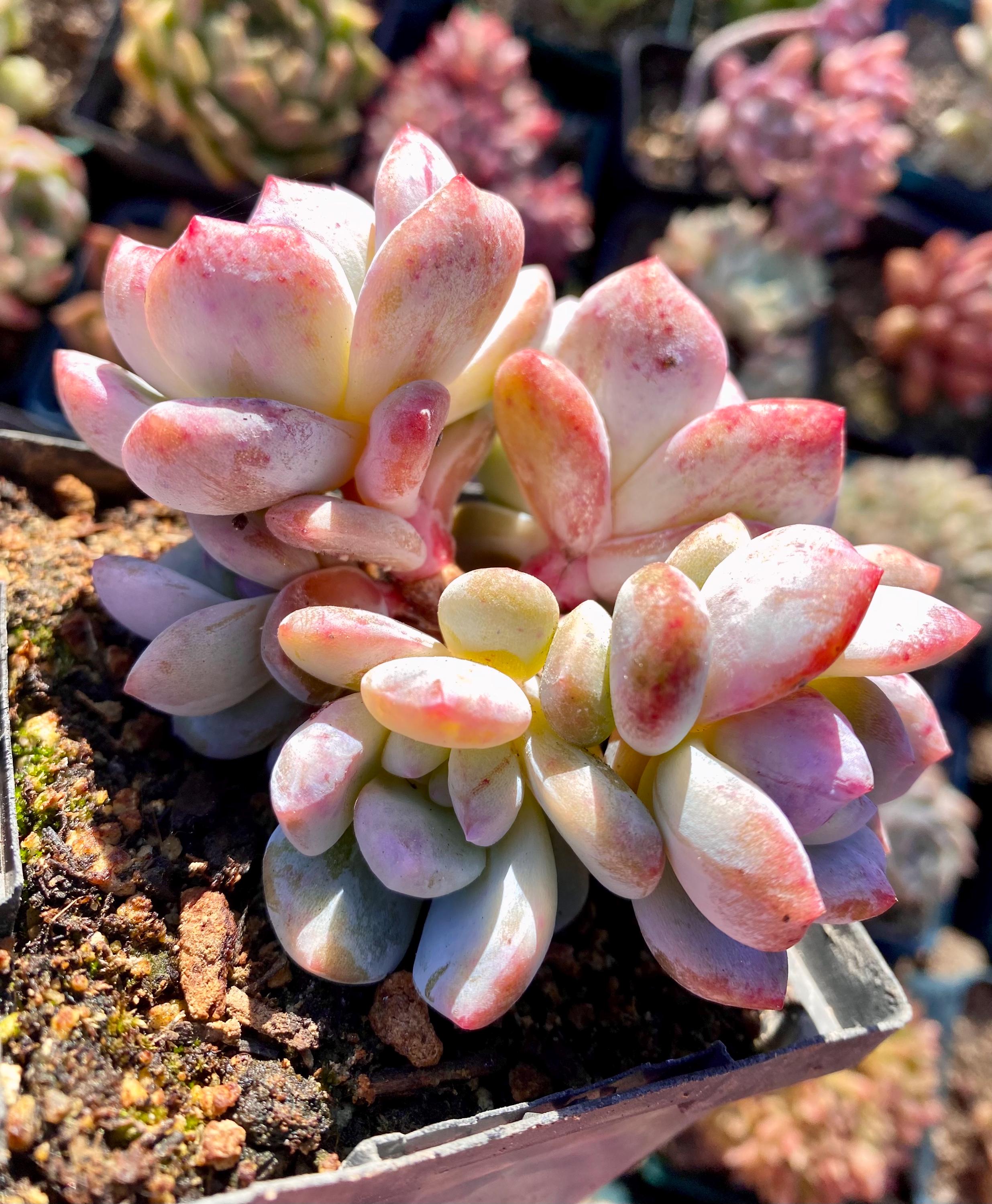 I took these pictures and video under natural light on October 7, this beautiful echeveria will become FULL PINK with variegated and monstrous patterns in cooler weather