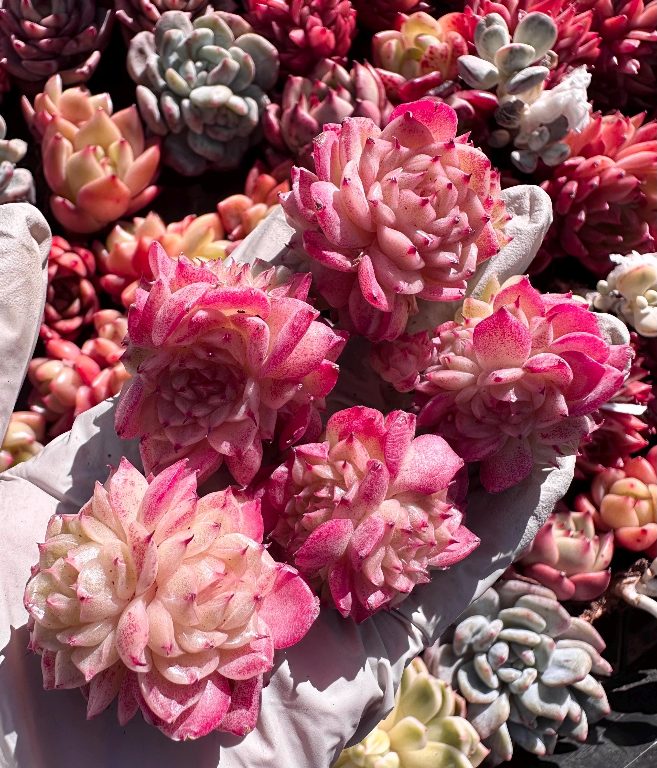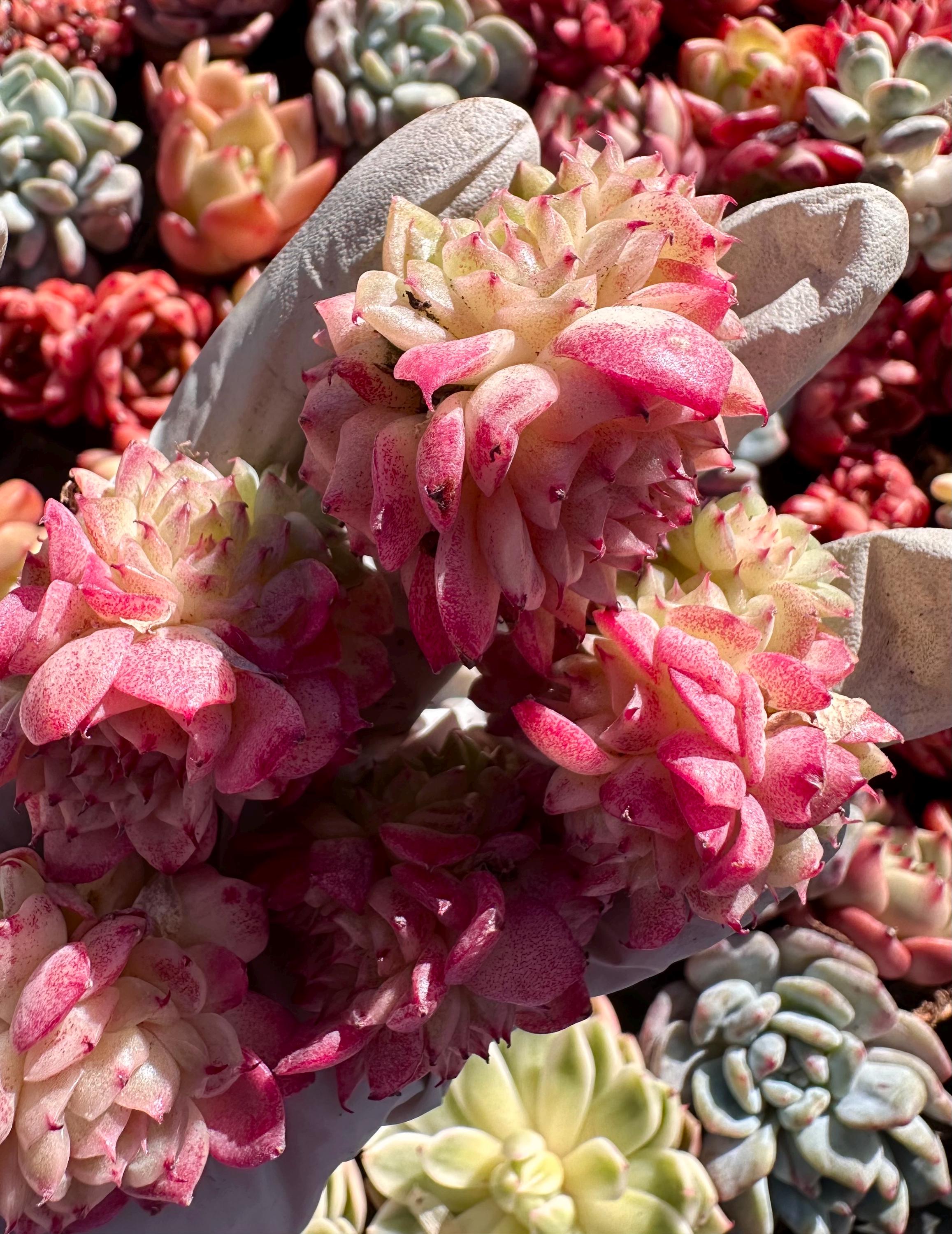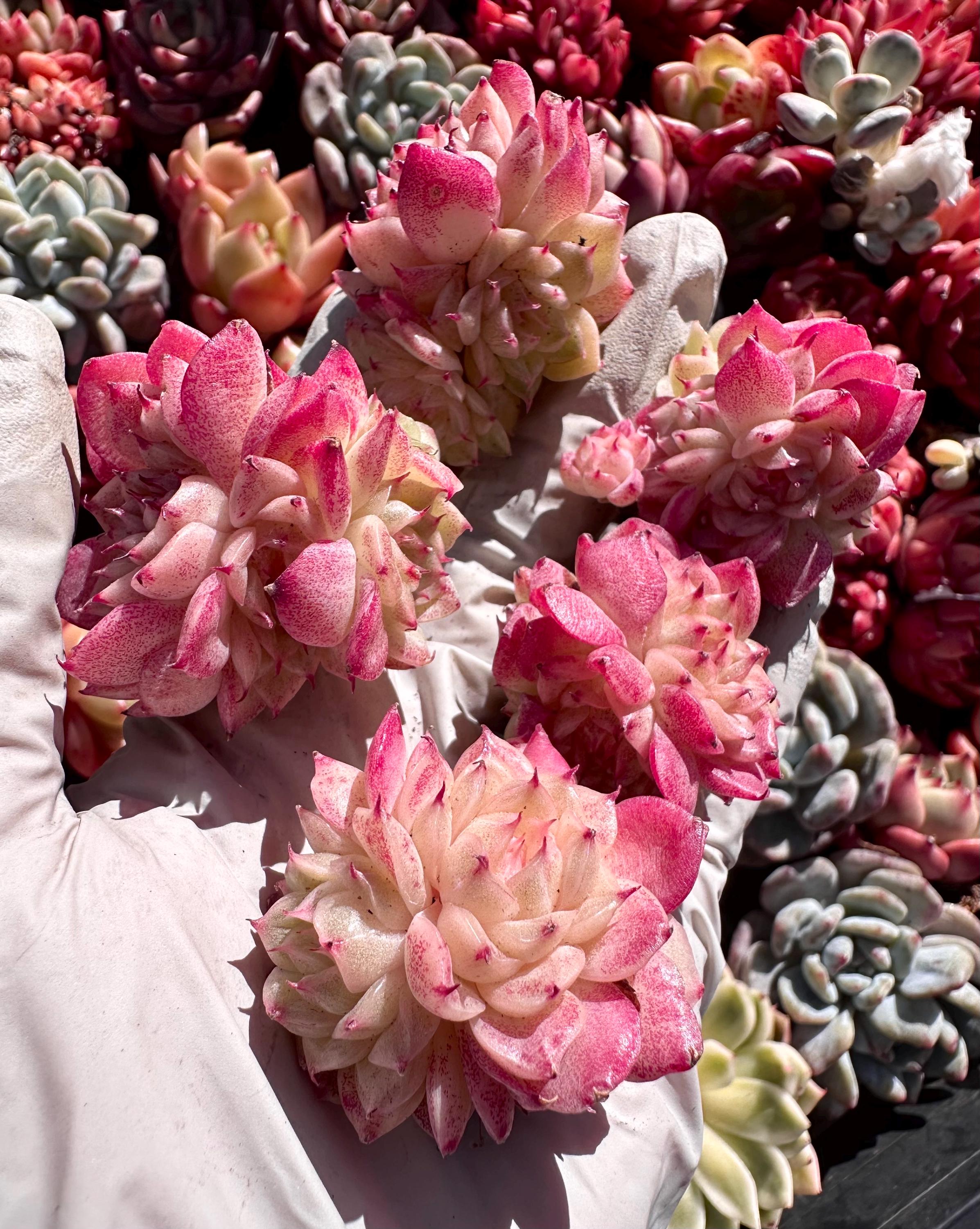SUPER PINK + rose red colorful , chubby and PINK red with tight form clusters, each cluster about 2″ (between 1.5″-2.5″ during shipping the leaves closed tightly) with a few heads about 3-5, beautiful little pink flowers