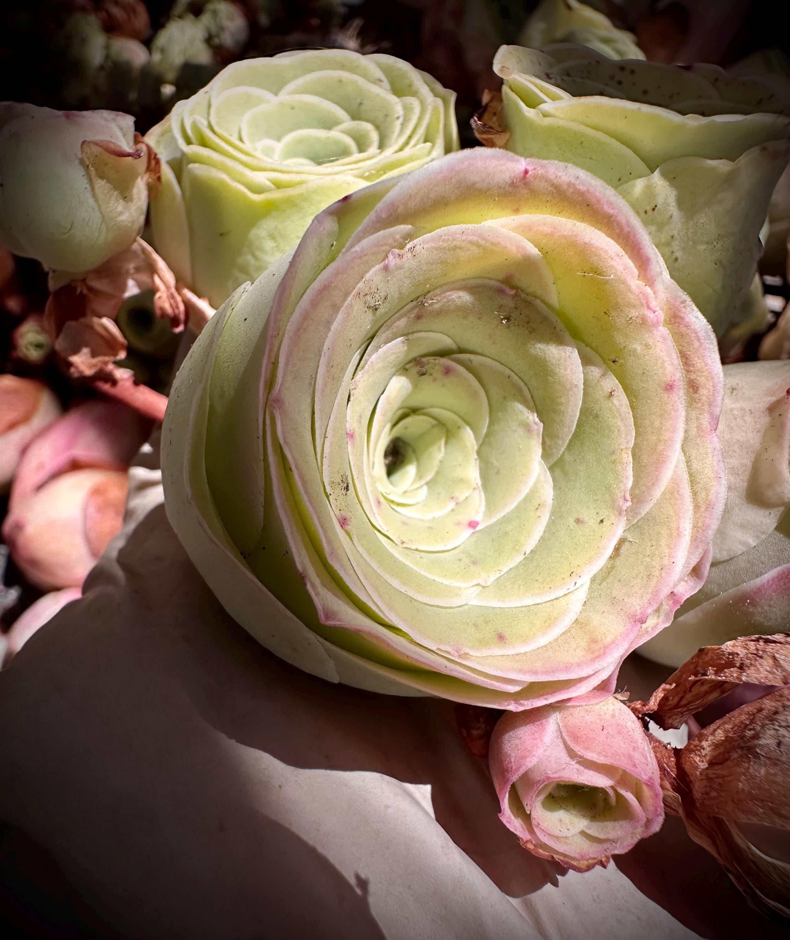 NOTE: Greenovia is a peculiar plant, please read the notes and descriptions carefully, review the pictures, make sure you know what you are getting. HIBERNATION May/Jun – Sep/Oct, the leaves wrap up tightly and put on pink color, plant becomes smaller; GROW SEASON Sep/Oct – May/Jun, leaves open and become green, plant will be much bigger. Regardless of any season, it just looks beautiful, like roses If you want a pink one, please order during hibernation season. During hibernation, there’s no need to water them, otherwise they may rot. You can put them in soil or simply put in pretty baskets as dry flowers. Once the leaves starts to open, the growing season starts, now they need to be planted and watered regularly, until next hibernation season.