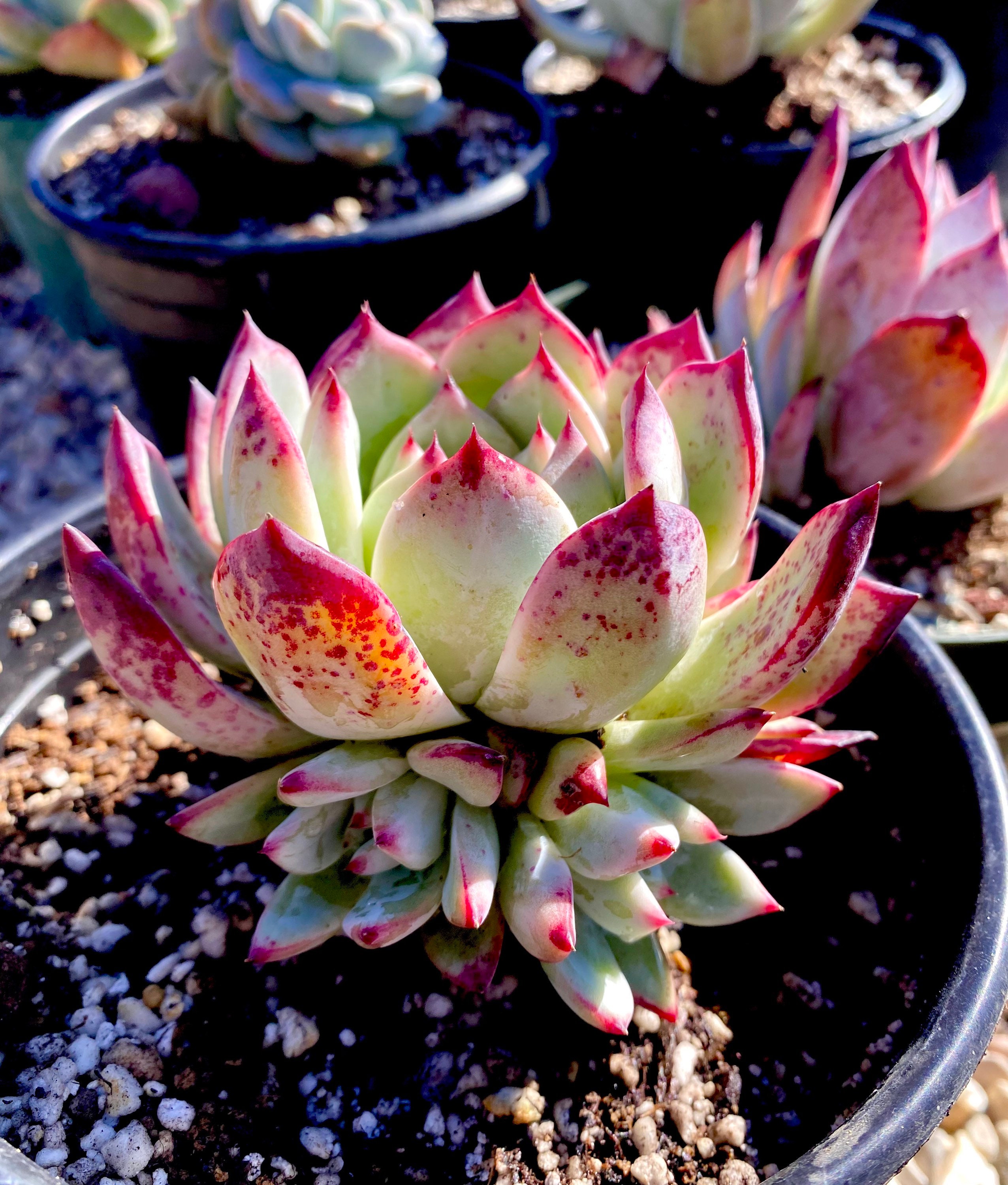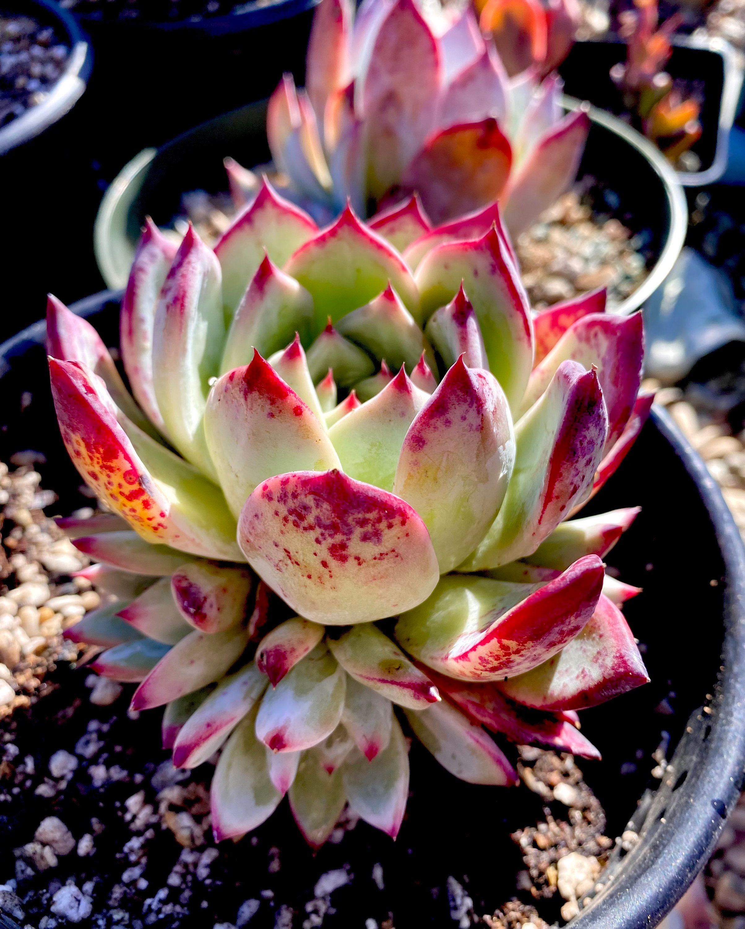 Show in 1 gallon pot, this cluster actual size is about 6.5”-7” , very chubby and healthy, a lot of amazing bloody freckles on the leaves, perfect condition for a bouquet , unique beauty