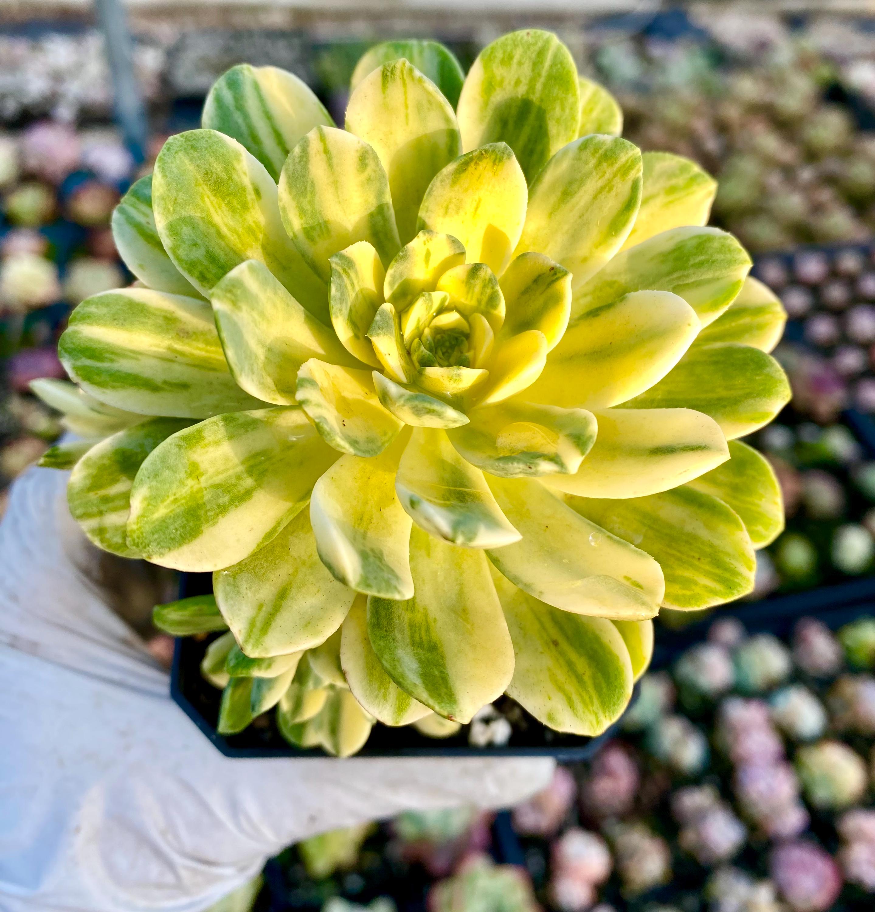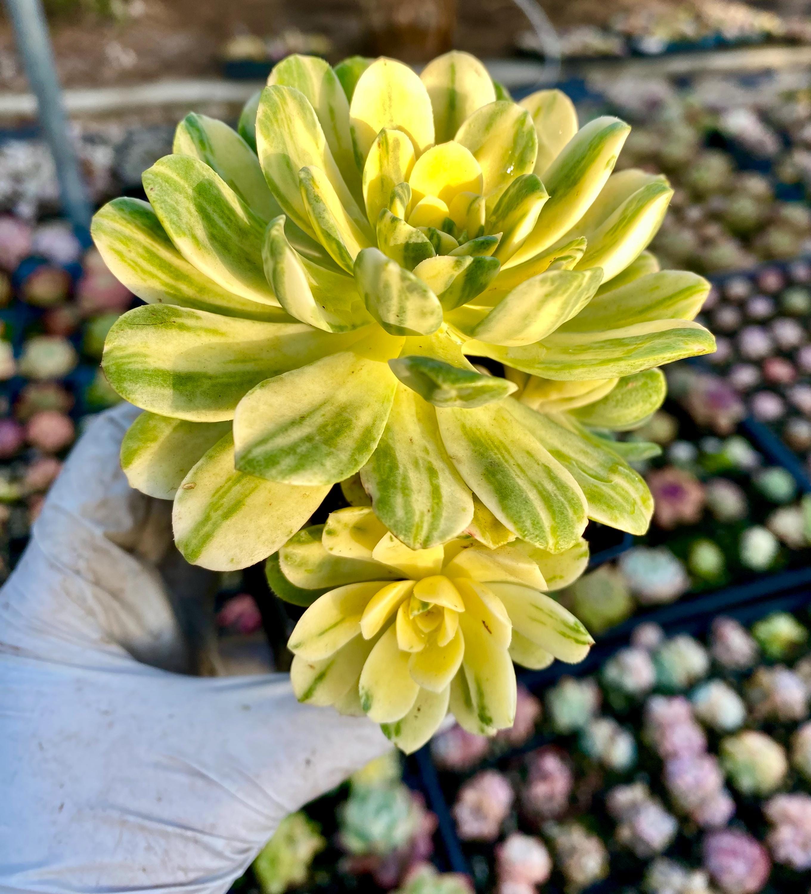 She is a 4 heads cluster, the actual size about 3.5″ , one HUGE perfect bright yellow mom plus 3 pretty bright creamy Rosettes on the stem for this perfect bouquet , 2 of the rosettes are almost FULL variegated , strong stems and roots, perfect variegated flowers