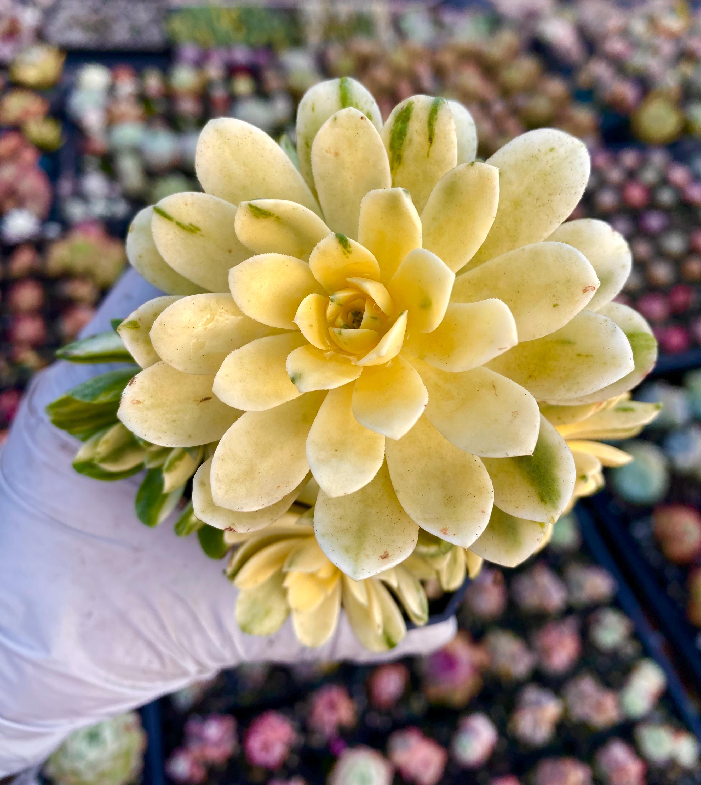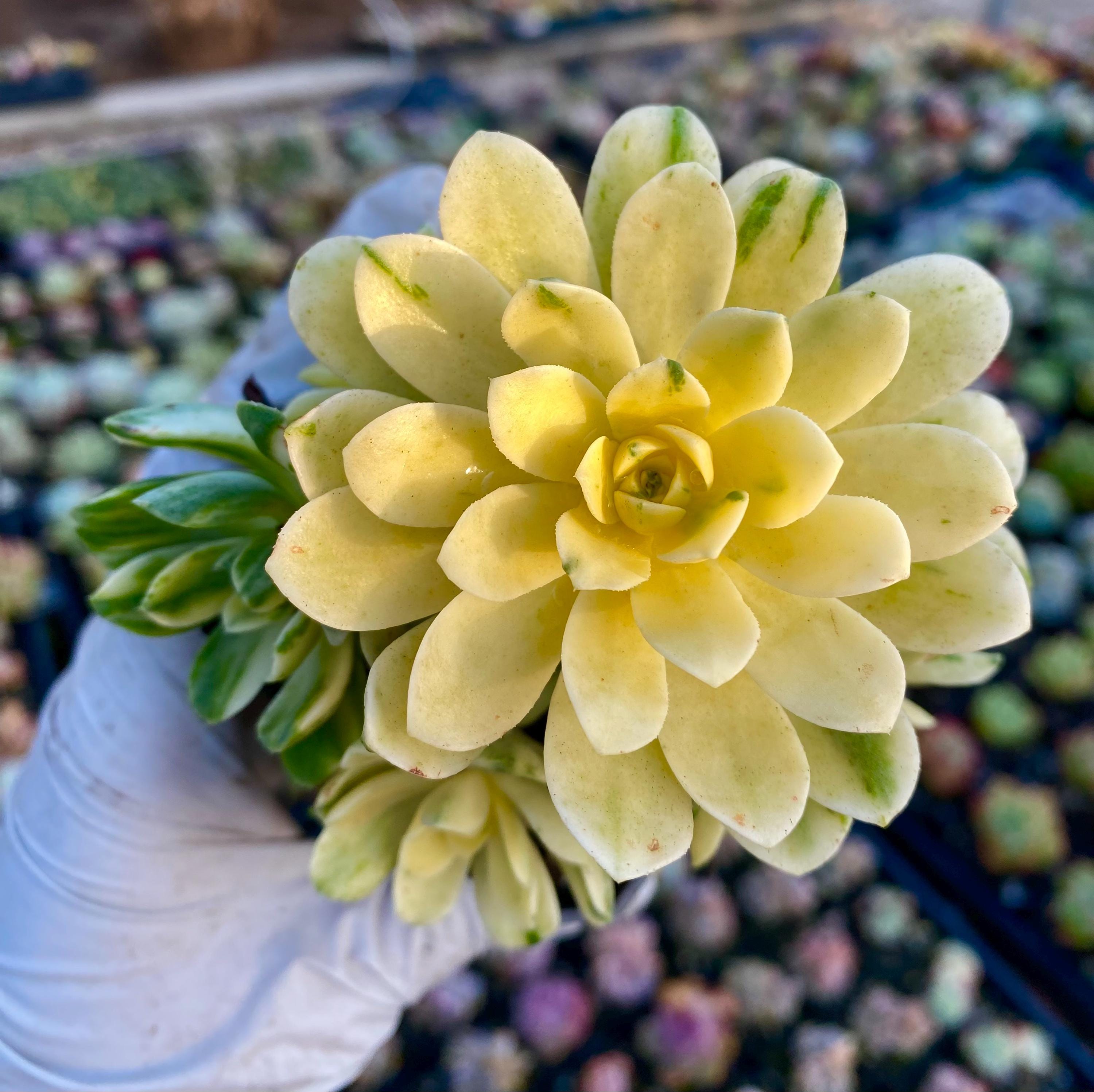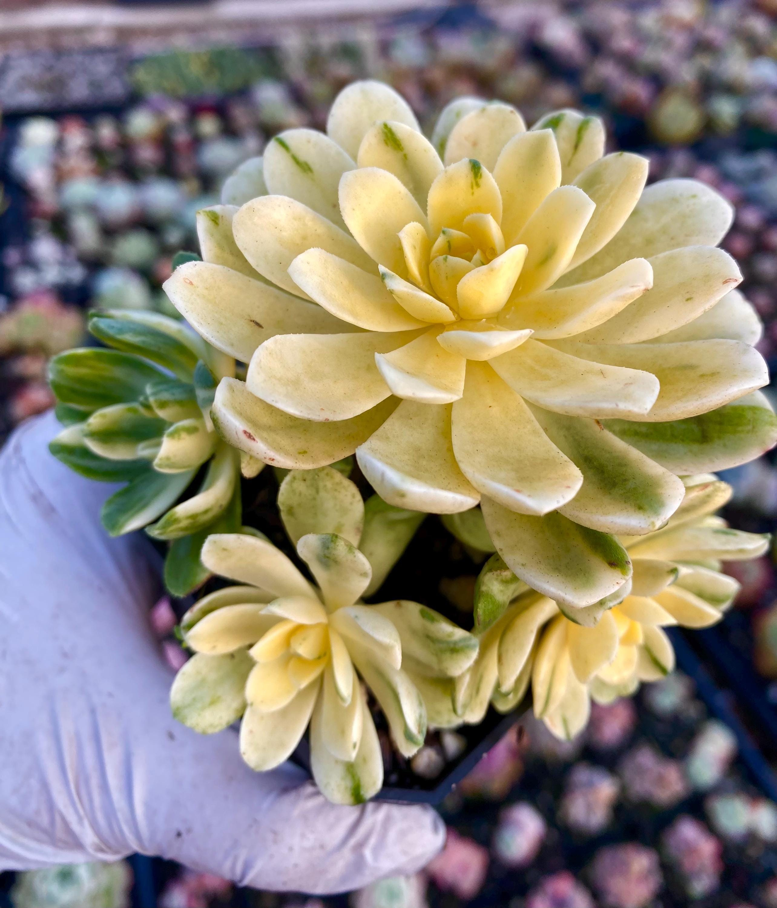 She is a 6 heads cluster, the actual size about 3.5″ , one HUGE perfect full bright yellow mom plus 5 pretty bright creamy Rosettes on the stem for this perfect bouquet , 3 of the rosettes are almost FULL variegated , strong stems and roots, perfect variegated flowers